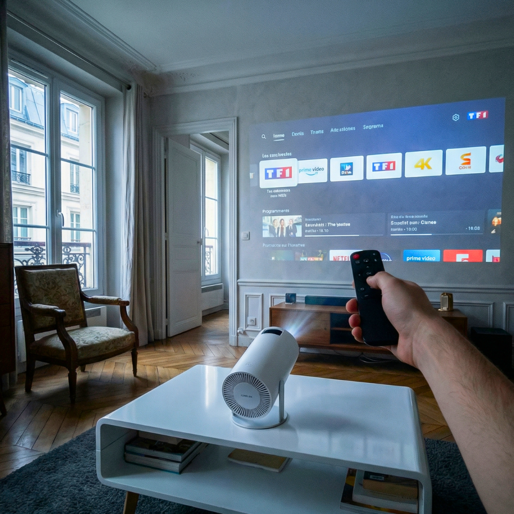 L’installation est hyper simple et le projecteur trouve facilement sa place dans le salon. Pas besoin de réglages compliqués, ça fonctionne tout de suite.